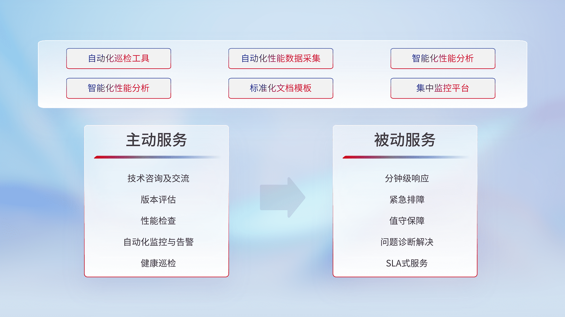 智能化工具和标准化文档,,保障服务质量,,提供主动服务(包含技术咨询、、、版本评估、、性能检查、、、、自动化监控与告警、、、、健康巡检)和被动服务包含(分钟级响应、、、、紧急排障、、、值守保障、、、、问题诊断解决、、SLA服务)。。。。
